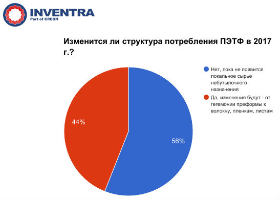 Эксперты отрасли однозначно сходятся во мнении, что структура потребления ПЭТФ будет смещаться в сторону текстиля, ПЭТ-волокна и пленочного ПЭТ. Несмотря на это, производство пищевой тары из ПЭТФ останется крупнейшим сегментом потребления в нашей стране в обозримом будущем. Это подтверждается и проведенным на конференции голосованием: