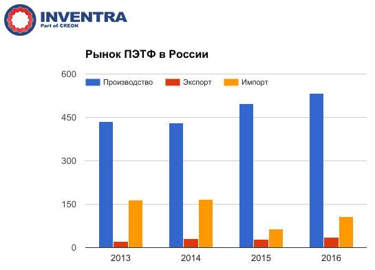 В России по итогам 2016 г. было произведено 534 тыс. т ПЭТФ (на 7% больше, чем годом ранее), импорт составил 108 тыс. т, экспорт - 36 тыс. т. Такие данные сообщил почетный президент «АРПЭТ» Виктор Керницкий. Ведущим производителем он назвал «Полиэф» (40%), за ним следуют «Алко-Нафта» (29%), «Сенеж» (17%) и «Сибур-ПЭТФ» (14%).