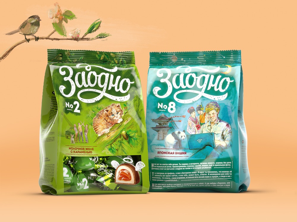 Брендинговое агентство Depot WPF и кондитерская фабрика «Коммунарка» представили новый бренд конфет «Заодно». Под маркой выпускается 13 видов конфет, каждому из которых соответствует своя иллюстрированная история.
