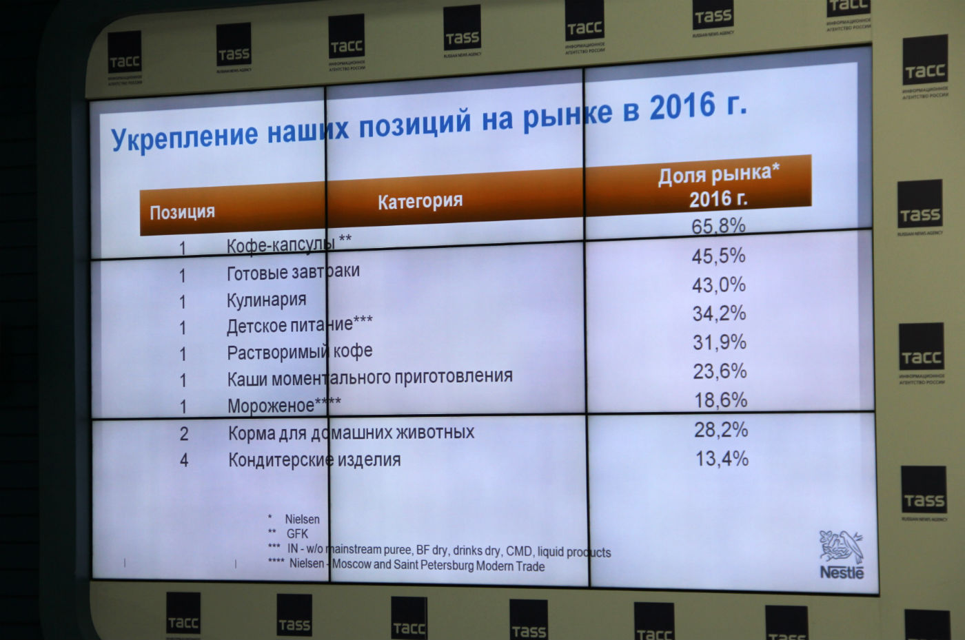 В течение прошлого года «Нестле» сумела значительно укрепить свои лидирующие позиции в регионе Россия-Евразия в рамках большинства категорий продукции, что было достигнуто в первую очередь благодаря чуткому отношению к потребностям и удовлетворению нужд покупателей посредством предоставления широкого ассортимента новых продуктов, а также за счет постоянных инноваций и эффективной маркетинговой поддержки стратегических брендов компании. В 2016 году «Нестле» добилась значительного увеличения доли рынка по следующим категориям продукции: кофе в капсулах (65,8%); готовые завтраки (45,5%); кулинарные продукты (43%); детское питание (34,2%); растворимый кофе (31,9%); каши быстрого приготовления (23,6%); корма для домашних животных (28,2%) и кондитерские изделия (13,4%).