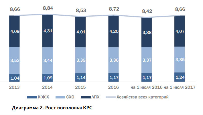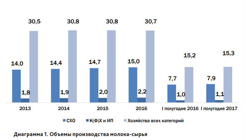 Что касается поголовья КРС, то за последние три года активный рост наблюдался только в крестьянских фермерских хозяйствах (КФХ) (см. диаграмму 2). С 2013 года рост составил 19,2%, при этом поголовье в сельхозорганизациях (СХО) осталось на уровне 2013 года, как и количество голов во всех категориях хозяйств. Очевидно, что для полноценного импортозамещения и увеличения объемов производства молока необходим прирост дойного стада в сочетании с ростом продуктивности.