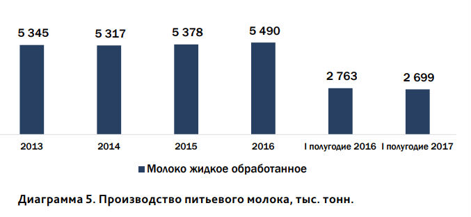 Объем производства питьевого молока с 2013 года по 2016 год вырос всего на 2,7%, причем в первой половине 2017 года наблюдалось сокращение на 2,3% (см. диаграмму 5). Стабильное потребление традиционного для России продукта – молока – объясняется его доступностью, а также сдерживанием роста цен со стороны государства, что позволило немного увеличить объемы потребления, в отличие от молокоемких продуктов, таких как сыр.