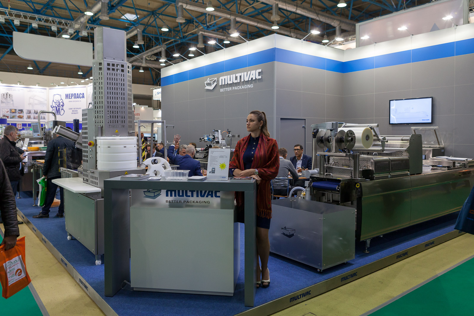 Компания ULMA Packaging (Испания), вообще, имела два стенда. Один в первом павильоне, где демонстрировалась машина системы «флоупак» модели FR 200, другой – во втором павильоне, ближе к технологиям получения мясных и рыбных полуфабрикатов. И техника там стояла соответствующая, по упаковыванию в лоток в среде МГА.