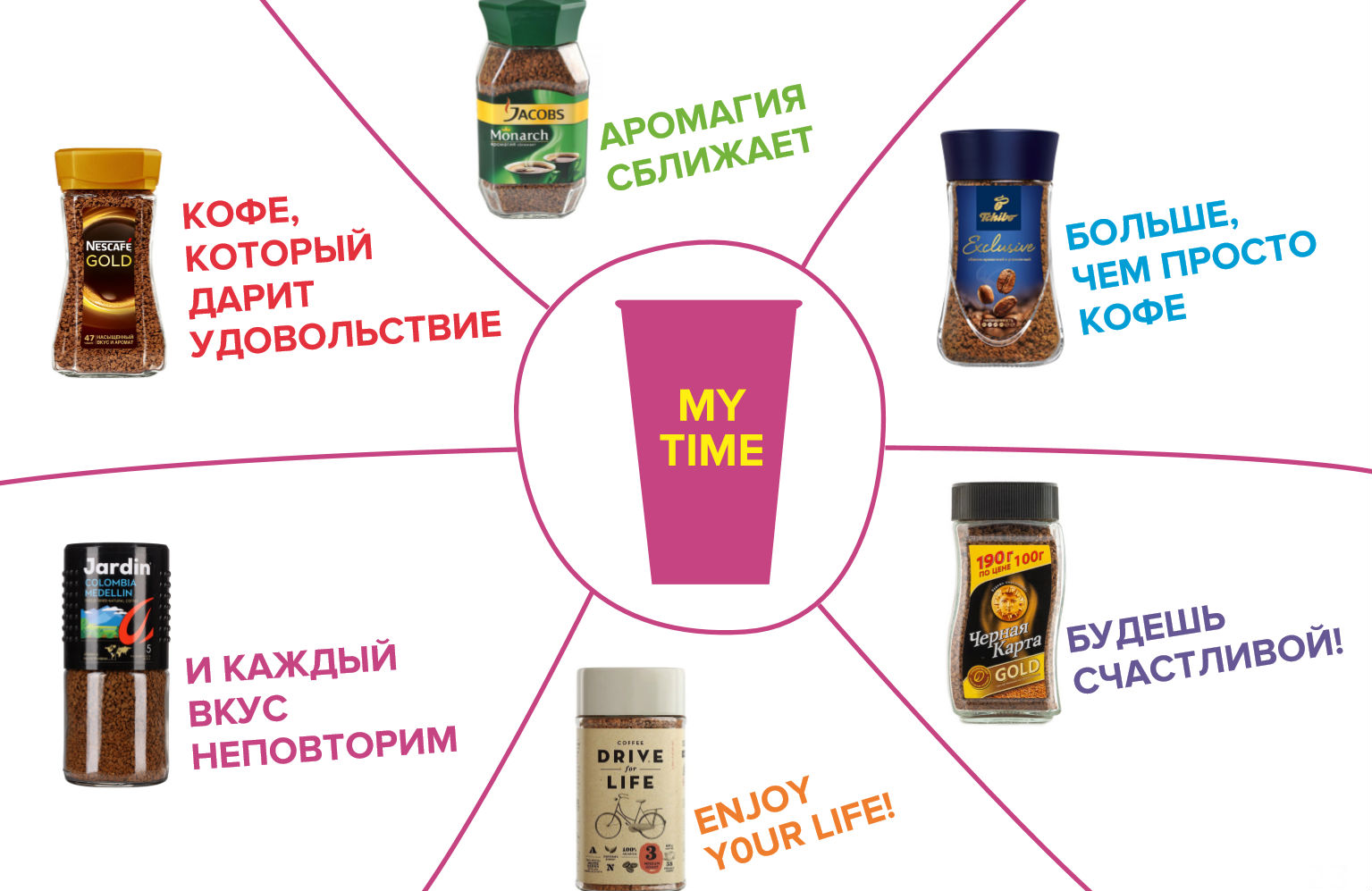 «MyTime» входит в средний сегмент с ценой 268 р, у конкурентов цена колеблется от 224р до 269р. Именно в этом ценовом сегменте сосредоточена большая часть марок растворимого кофе, и их месседж аудитории апеллирует к эмоциям: наш кофе дарит наслаждение и бодрость!