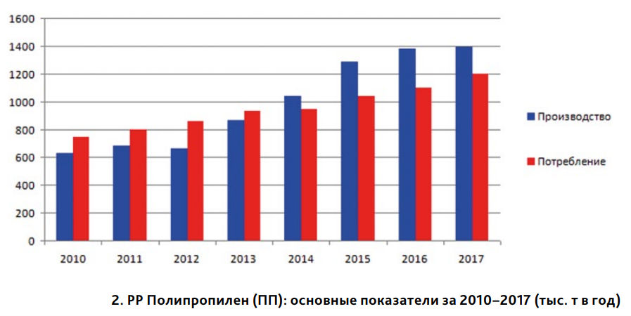 В последние годы ввод новых мощностей привел к росту производства базовых полимеров. По сравнению с 2010 г., выпуск пяти видов полимеров (PE, PP, PS, PVC, PET) вырос почти на 55% и, по экспертной оценке, в 2017 г. превысил 5 млн т. Спрос рос гораздо медленнее – плюс 17.5% за семь лет, и по итогам года потребление ожидается на уровне 5.13 млн т. Суммарные мощности производства полимеров составляют 5.44 млн т. При этом заметный профицит мощностей наблюдается в сегменте полипропилена, а дефицит - в производстве эмульсионного ПВХ, ПЭТФ пленочного и волоконного назначения и линейного ПЭ.