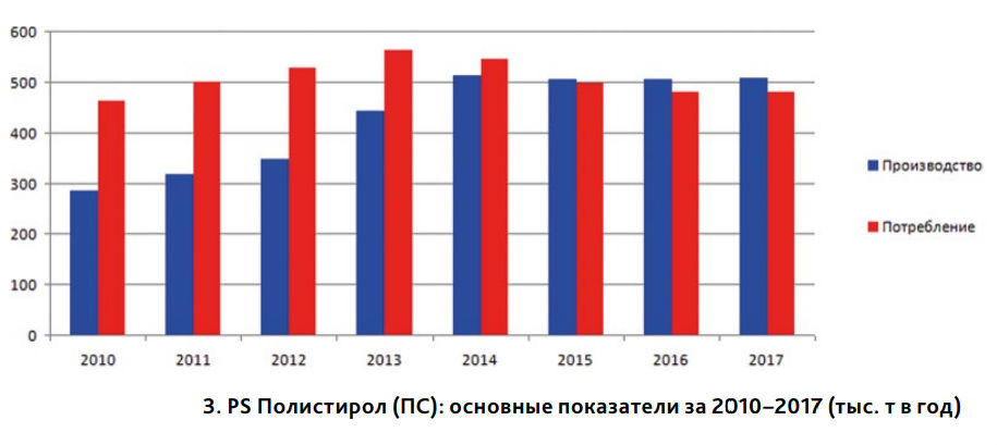 Несмотря на почти двукратный рост производства ПС с 2010 г., потребление полимера снижается уже четвертый год после своего максимума в 2013 г. Производственные мощности близки к максимальной загрузке, а предложение от производителей ПС превышает спрос. В структуре производства ПС по видам лидирует ПСОН/УППС (73,8%), вспенивающийся ПС занимает 23%. Что касается АБС, его дефицит ощущается на рынке достаточно остро, производство составляет лишь 3,2% от общего объема выпуска стирольных пластиков.