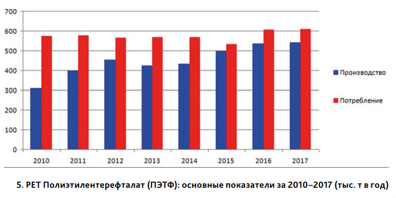 В России в 2017 г. было произведено 540 тыс. т ПЭТФ, а потребление составило 610 тыс. т. Ведущим производителем является «Полиэф» (40%), за ним следуют «Алко-Нафта» (29%), «Сенеж» (17%) и «Сибур-ПЭТФ» (14%).