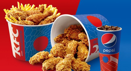 «Перед командой было поставлено несколько основных задач, – рассказывает арт-директор проекта Никита Иванов. – Во-первых, необходимо было синхронизировать фирменную стилистику бренда с брендом Pepsi. Во-вторых – подготовить брендированную упаковку для креативной идеи «11x11»: 11 стрипсов и 11 куриных крыльев в одном баскете. Отличная, кстати, идея: и с числом игроков футбольной команды перекликается, и с «11 травами» фирменного рецепта. Нам удалось комплексно решить обе задачи: объединить бренды общей графикой, сохранив при этом идентичность обоих, и органично вписать их в придуманную нами «футбольную» стилистику. Кроме того, в рамках проекта мы разработали несколько упаковок для продуктов «ограниченной серии», дизайн стакана для напитков, упаковку для сервиса доставки KFC и упаковку нового для сети продукта – хот-дога».