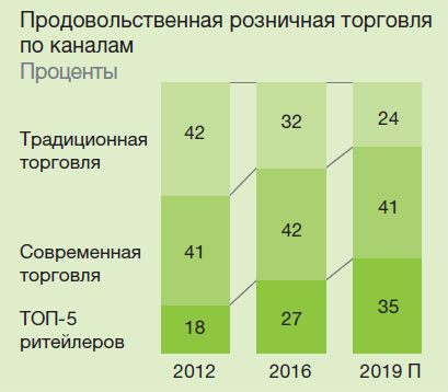 Традиционная розница постепенно уступает место современным форматам розничной торговли: на их долю сегодня приходится 68% российского розничного рынка, причем примерно 27% рынка принадлежит пятерке продовольственных ритейлеров.