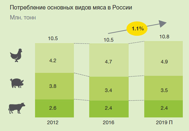 Несмотря на признаки восстановления экономики, в ближайшие годы ожидается минимальный рост спроса на мясную продукцию. Потребители переключились на более доступные товары, в частности, на птицу- единственный сегмент, демонстрирующий рост в последние годы.