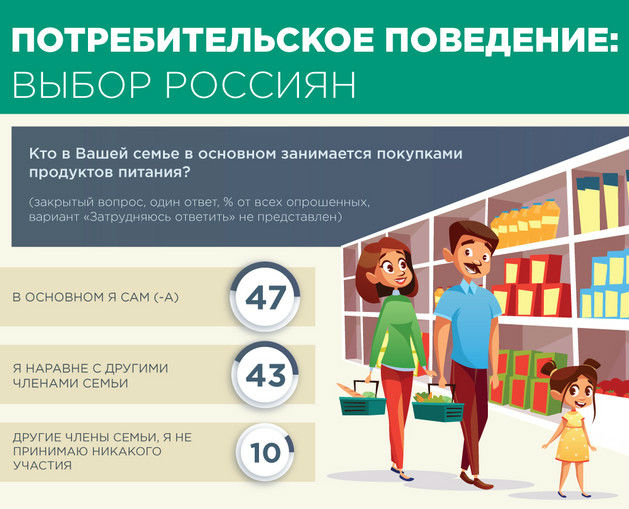 Вопрос о том, кто сегодня занимается закупкой продуктов питания в семье, значим для участников исследования, все дали на него определенные ответы. Среди мужчин почти треть (31%) убеждены, что являются основными ответственными в семье за покупку продуктов питания. Более половины мужчин (54%) полагают, что вносят такой же вклад в закупки, как остальные члены семьи, и 15% признают, что никак не участвуют в покупках продуктов. Мнения женской части опрошенных распределяются иначе. Почти две трети женщин (61%) полагают, что именно они в основном отвечают в семье за покупку продуктов. Треть (34%) ощущают помощь других членов семьи и признают, что сами участвуют в этом процессе наравне с ними. И всего 5% женщин не принимают в покупке продуктов никакого участия.