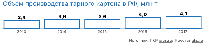 На сегодняшний день производство тарного картона в России развивается достаточно активно. В 2017 году объем внутреннего производства достиг 4,1 млн т, темп рост отрасли составил 2,5%.
