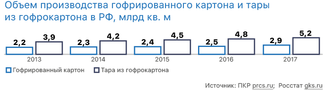 Отрасли-потребители данной продукции показывают в последние годы стабильный рост. В частности, в 2017 году объем производства гофрированного картона составил 2,85 млрд кв. м (по сравнению с 2016 годом выпуск +15%); объем производства тары из гофрированного картона составил 5,16 млрд кв. м (рост +8%).