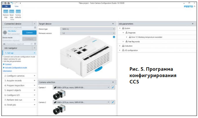 Встроенная система диагностики может сообщить о текущем состоянии устройства и ошибках с помощью светодиодов состояния. Конфигурация параметров происходит с помощью свободно распространяемого программного обеспечения от Festo Camera_Configuration_Studio (рис.5), которое доступно для скачивания на сайте .