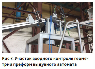 Для высокопроизводительных автоматов выдува ПЭТ-тары (Рис 8) контроль качества геометрии горла преформы стал также актуален. При высокой температуре в цеху производства напитков (более 40oC) готовые преформы могут деформироваться. Причем весьма незначительная деформация может привести к останову автомата или даже к поломке. Для повышения надежности, а также для исключения простоев из-за заклинивания решено было оснастить автомат выдува входным контролем геометрии преформы. Как правило, для контроля геометрии используются серьезные комплексы технического зрения, однако для решения поставленной задачи возможно было использовать простой видеодатчик SBSI-Q Festo с внешней инфракрасной подсветкой SBAL (Рис 7). Именно использование инфракрасной подсветки, расположенной определенным образом, а также детектора определения контура явились залогом успеха в этом проекте. Срабатывание камеры – по датчику, сброс – пневмоцилиндром. Производительность машины до 12000 бутылок в час (200 бут/мин).