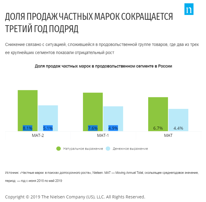 Несмотря на отрицательную динамику роста и снижение доли на рынке FMCG, частные марки продолжают представлять конкуренцию брендам производителей. Почти 40% российских потребителей, опрошенных в рамках исследования Nielsen «Частные марки: в поисках долгосрочного роста», сказали, что покупают СТМ при каждом посещении магазина. Для них все больше растет значимость таких факторов как вкус продуктов и их ассортимент. Вкус товаров СТМ в первую очередь важен при выборе для 25% респондентов (33% в группе с высоким доходом), а ассортимент — для 22%. Разнообразие товаров под частными марками еще важнее для молодого поколения. В группе 18-24 лет об этом заявили 35% респондентов.