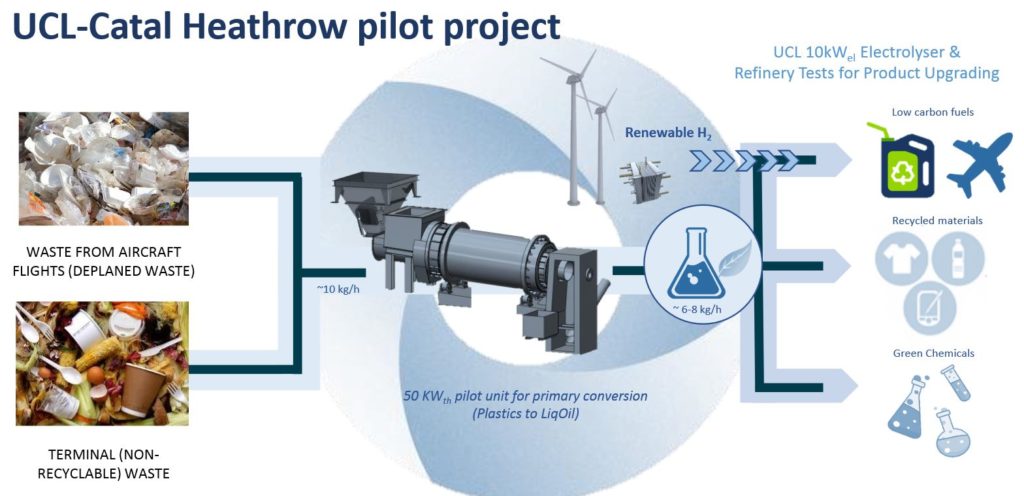 В настоящее время в Хитроу перерабатывается только около 50% отходов из аэропорта и салонов самолётов. Это сопоставимо со степенью вторичной переработки в большинстве местных органов власти, несмотря на строгие правила, действующие в отношении отходов из салонов лайнеров, совершающих международные рейсы, для защиты здоровья животных и растений, что означает, что часть отходов отправляется на сжигание или на свалку. Опытная установка, разработанная лауреатами премии Хитроу за инновации, базирующейся в Шеффилде компанией Catal и доктором UCL Массимилиано Матерацци (Massimiliano Materazzi), способна позволить отказаться от сжигания и захоронения до 5000 т отходов, превращая их в жидкую масляную фракцию для переработки каждый год.