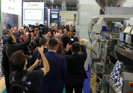На стенде во 2 павильоне стояли интересные высокопроизводительные образцы. Термоформер TFS 200 MSV, который позволяет производить упаковывание продуктов в лотки тремя способами: в модифицированную газовую среду, в вакуум, получать упаковку «скин». Так сказать, «три в одном». Причем, переналадка производится быстро. Еще один автоматический трейсилер TSA 680 производительностью до 20 упаковок в минуту. Ну, и горизонтальная упаковочная машина системы «флоупак» модели FM 505 для упаковывания в МГА с движением губок box-motion. Ее характеристики: производительность – до 250 упаковочных единиц в минуту; размеры упаковываемых изделий: длина 30-50 мм, ширина 25-250 мм, высота 5-100 мм. Габаритные размеры машины: 3315×1475×1865 мм.