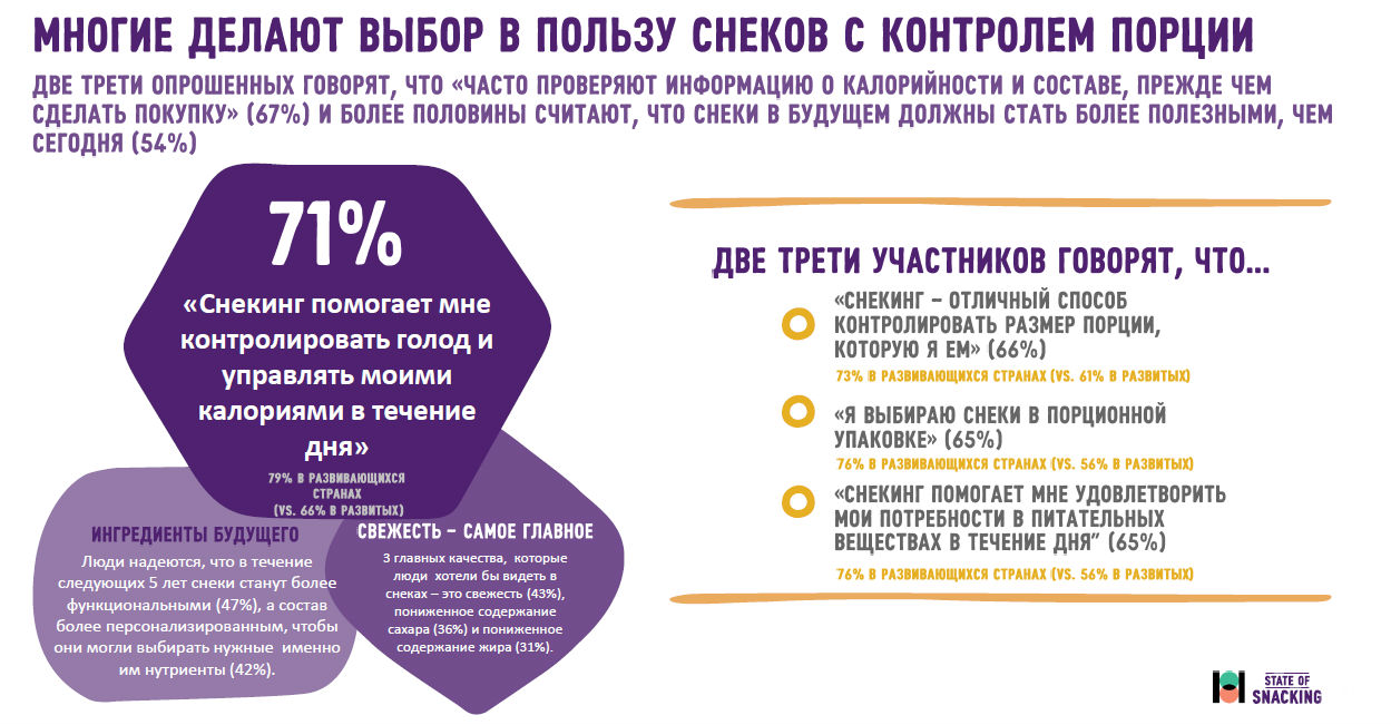 В России 63% опрошенных не представляют свою жизнь без снекинга. Трое из четырёх взрослых россиян утверждают, что перекусывать одинаково важно для их умственного (76%) и эмоционального (74%) благополучия, как и для состояния здоровья вообще. Таким образом, снеки становятся важной частью дневного рациона. А в Индонезии, например, участники опроса считают, что перекусывать в течение дня полезно в основном для поднятия настроения.