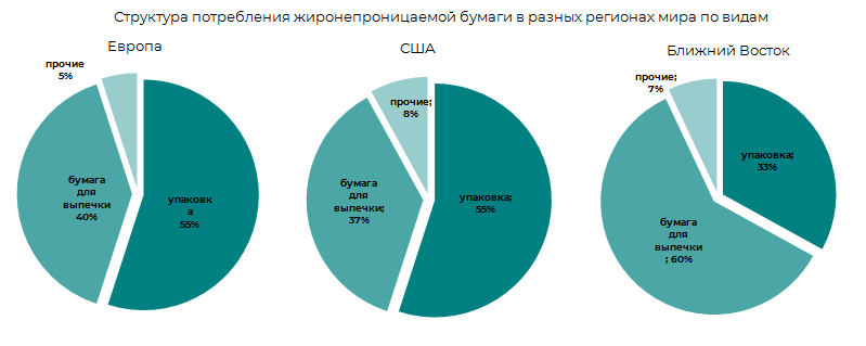 В структуре потребления большинства стран Европы и Северной Америки преобладает бумага для упаковки (в основном подпергамент). Его доля составляет 55%. Еще 35–40% приходится на бумагу для выпечки, остальное — на прочие виды жиронепроницаемой бумаги. В странах Юго-Восточной Азии потребляется чуть меньше подпергамента, а на Ближнем Востоке более 60% — это бумага для выпечки, в которой готовят разнообразные сладости, лепешки, мясные и овощные блюда и многие другие продукты.