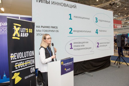 Докладчик перечислила четыре основных типа инноваций: революционные, фундаментальные, поддерживающие и подрывные. Поддерживающие в большей степени характерны для рынка FMCG-товаров и позволяют в определённой степени улучшить их потребительские свойства.