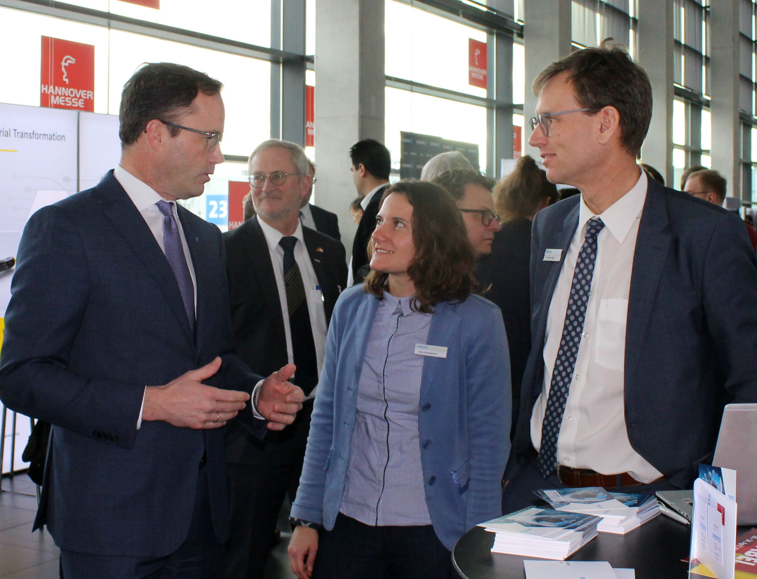 Сотрудники компании Festo беседуют с Йохеном Кёклером, председателем правления Hannover Messe (на фото слева)