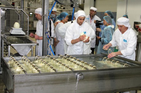 На заводе сначала обращает на себя внимание, казалось бы, чрезмерная чистота – блеск и белизна. На деле, ничего чрезмерного, всё по самым строгим стандартам: гигиена – основное условие сырного производства. Второе, на что обращаешь внимание, – это современное оснащение предприятия, высококлассное оборудование. Завод способен перерабатывать 120 т молока в сутки, и этот объём планируется увеличить до 250 т. Журналистам повезло, как раз в это время изготавливалась партия сыра качокавалло. Это полутвёрдый итальянский сыр, технология производства которого схожа с изготовлением моцареллы и других вытяжных сыров. Надо сказать, интересное зрелище: блестящее оборудование, ванны с водой, люди в белом работают с белой упругой сырной массой, придавая ей особенную форму, напоминающую мешок. Так уж устроен человек, ему никогда не надоест смотреть, как работают другие.