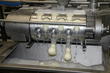 Готовую продукцию упаковывают на двух линиях. Одна из них – линия на основе упаковочной машины PFM с комбинационным весовым дозатором (мультиголовкой). Мы смогли увидеть, как машина дозирует маленькие кругляшки сыра чильеджина, и порции попадают в сформированный на машине пакет. Эта линия способна упаковать 600-700 кг сырной продукции в час. Другая машина, работающая в цехе, имеет несколько меньшую производительность. Вместе они упаковывают примерно тонну сыра в час.