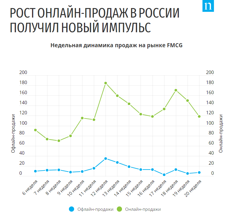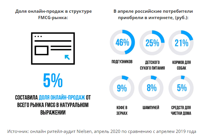 Благодаря высоким темпам роста доля онлайн-продаж ряда FMCG-категорий зафиксировалась на принципиально новом уровне, в некоторых случаях она удвоилась по сравнению с прошлым годом. Так, по данным Nielsen, в апреле от всего рынка FMCG на онлайн-торговлю в денежном выражении пришлось более 25% продаж сухого детского питания, 21% кормов для собак, 9% зернового кофе, 5% средств для чистки дома, 3% шоколадной пасты, 3% воды, 2% макарон, 1% жевательной резинки. Почти каждый второй подгузник (46%) был продан онлайн — это рекорд как для самой категории, так и для рынка FMCG в целом.