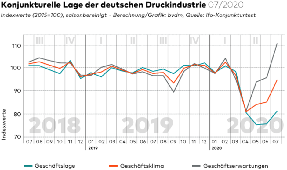 В июле 2020 г. типографии и медиакомпании, опрошенные институтом Ifo, оценили свою текущую деловую ситуацию и перспективы несколько лучше, чем в июне. Значения текущего и ожидаемого экономического положения определяют развитие делового климата, который является хорошим предварительным индикатором состояния производства в немецкой полиграфической и медиаиндустрии.