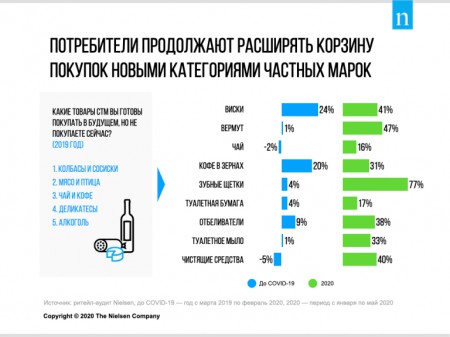 *Источники: , период до COVID-19 — год с марта 2019 по февраль 2020 по сравнению с аналогичным периодом прошлого года; 2020 — период с января по май 2020 по сравнению с аналогичным периодом 2019. Исследование Nielsen «Частные марки: в поисках долгосрочного роста», июнь 2020 года.