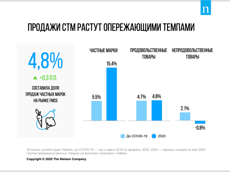 После периода снижения и стагнации доля продаж СТМ на FMCG-рынке продемонстрировала уверенный рост: за 12 месяцев с июня 2019 по май 2020 она увеличилась до 4,8% (с 4,5% годом ранее). Если до начала пандемии COVID-19 в России продажи частных марок росли в среднем на 5,5% в денежном выражении, то с января по май 2020 года ускорились почти в три раза — до 15,4%. Для сравнения, за тот же период продажи брендовых товаров в продовольственном сегменте выросли на 4,8%, а в непродовольственном стагнировали на уровне -0,8%.