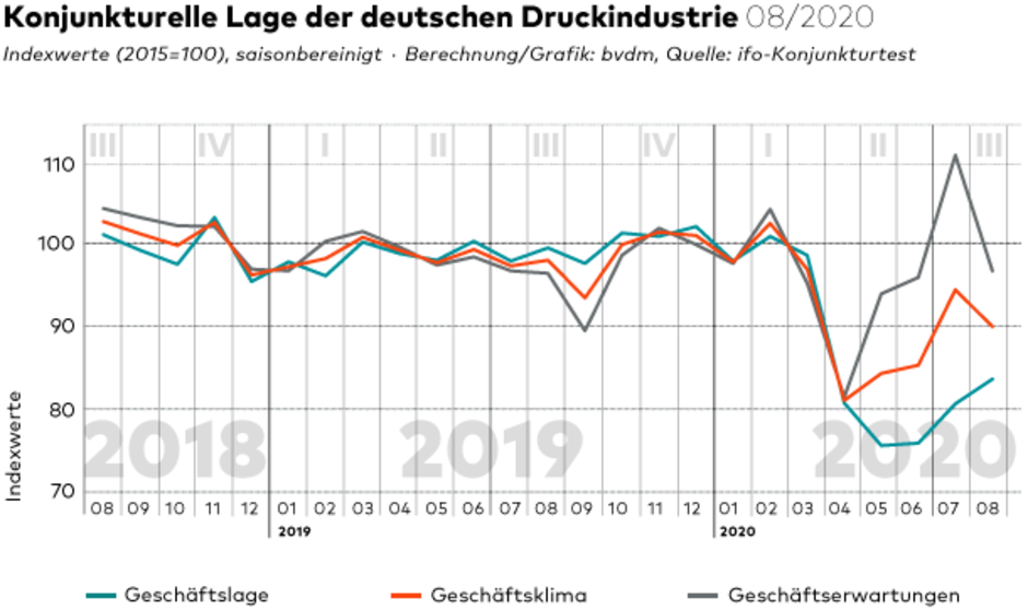 В августе 2020 г. типографии и медиакомпании, опрошенные институтом Ifo, оценили свою текущую деловую ситуацию несколько лучше, чем в предыдущем месяце. Значения текущего и ожидаемого экономического положения определяют развитие делового климата, который является хорошим предварительным индикатором состояния производства в немецкой полиграфической и медиаиндустрии.