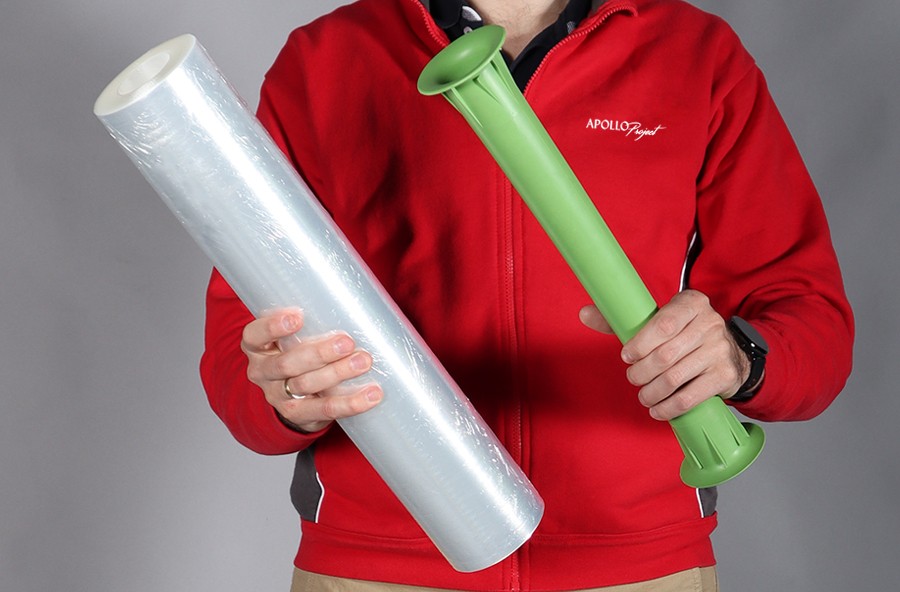 Во-вторых, мы стали выпускать инновационные плёнки APOLLO STRETCH™ ECOROLL без картонной втулки. Вместо нее используется многоразовый диспенсер. Представляете, сколько втулок ежемесячно нужно утилизировать крупным производствам? Мы рекомендуем простой способ, как этого избежать – диспенсер.