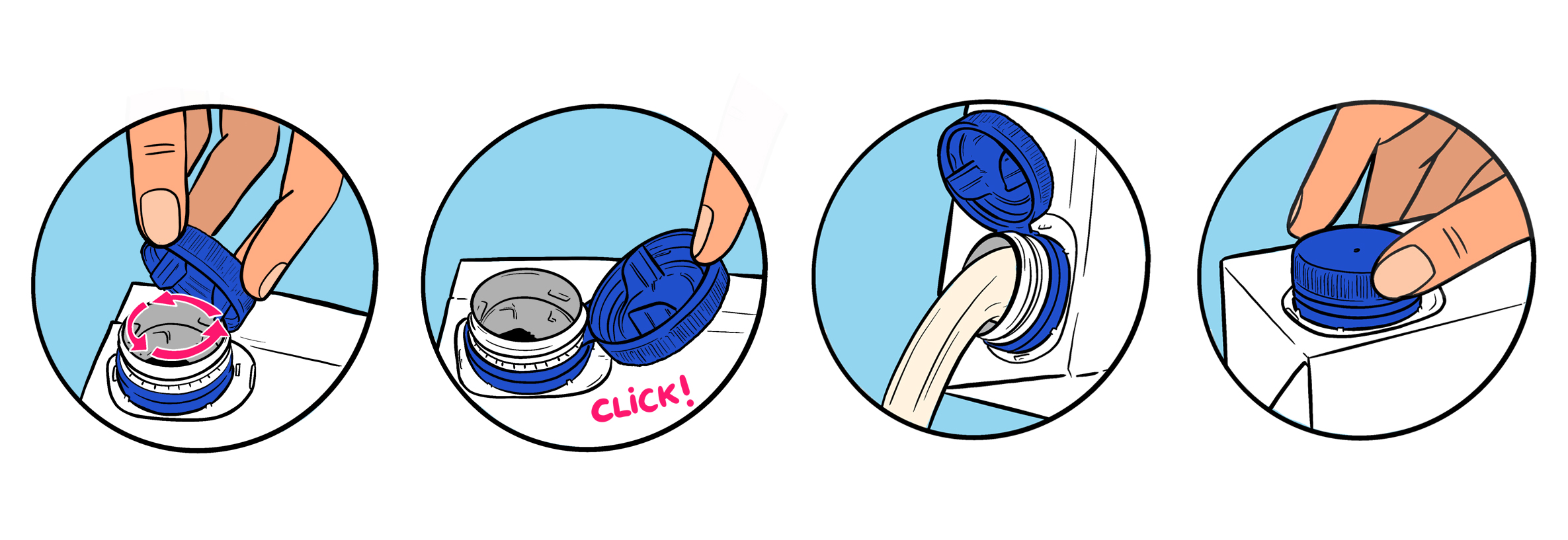 В прикреплённых крышках SIG используется надёжное решение, которое, как выяснилось в ходе маркетинговых исследований, оказалось очень подходящим для потребителей. Когда упаковка открыта для выливания, крышку можно надёжно зафиксировать в желаемом положении, нажав на неё до щелчка. Это означает, что потребитель может выливать жидкость из упаковки, не мешая колпачку и не прижимая колпачок пальцами. Для закрывания упаковки крышка просто слегка приподнимается перед закрытием обычным способом.