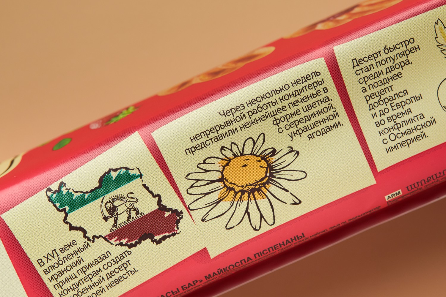 Так, например, на упаковке печенья с клубничной начинкой размещен рассказ о том, как в XVI веке влюбленный иранский принц приказал создать особый десерт для своей невесты. Кондитеры постарались и испекли печенье в форме цветка с нежной начинкой из джема посередине, знакомое нам как курабье. В Россию же десерт попал чуть позже, век спустя, во время царствования Екатерины Великой, которая была известна своей любовью к сладостям. Клеймы с историей мировых десертов команда DS1 branding дополнила иллюстрациями, словно нарисованными от руки на самой упаковке.