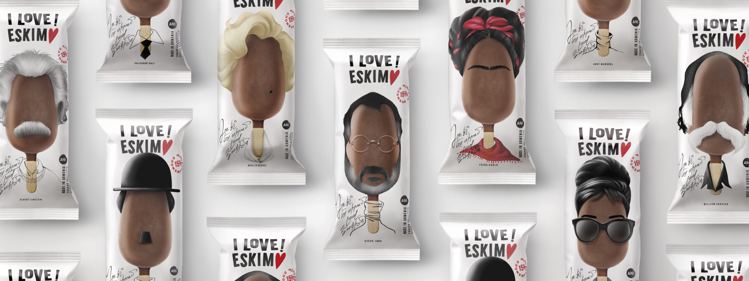 Художникам удалось изобразить причёски таким образом, чтобы не создавать неприязни или несовместимости с едой у чувствительных людей. На лицевой стороне упаковки находится подпись, напоминающая рукописный текст, на котором знаменитость общается с покупателем на местном языке: «Вы тоже любите хорошее эским ♥, верно?» Логотип и текст были выбраны чёрными, чтобы они были хорошо видны и легко читались. Белый матовый фон, выражающий свежесть и прохладу, позволяет хорошо выделять персонажей.