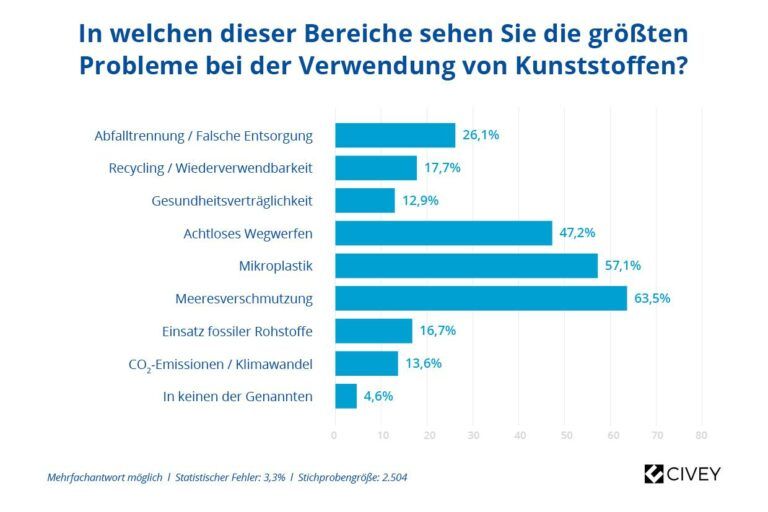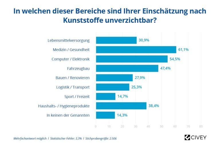 По информации , немецкий стартап в области опросов общественного мнения Civey опросил 2500 человек в Германии об их восприятии пластика. Результаты опроса показали, что у людей двоякое отношение к пластику. Кроме того, многим не хватает знаний о функциях пластмасс. Лишь очень немногие респонденты связывают пластик с защитой климата.