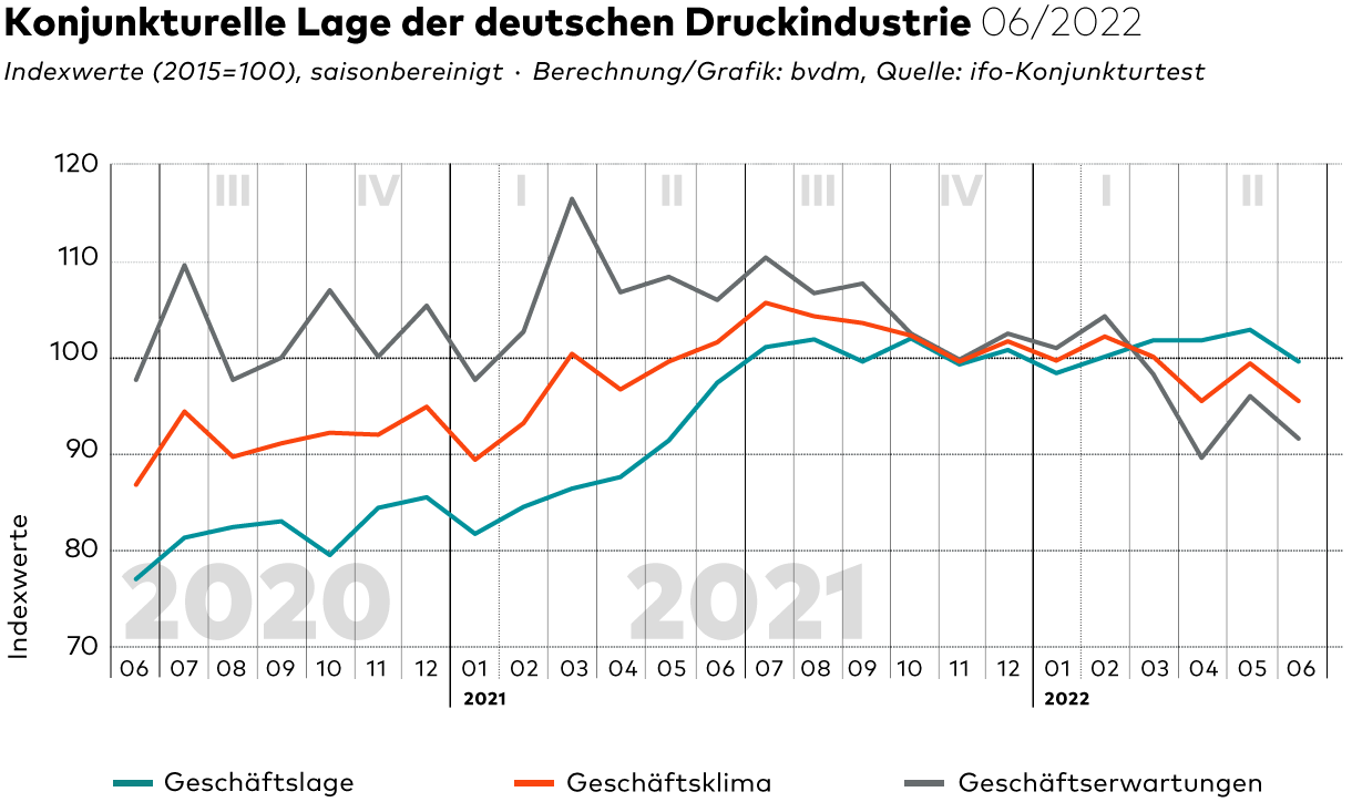В июне 2022 г. печатные и медиакомпании, опрошенные Институтом Ifo, оценили текущую деловую ситуацию и свои ожидания в отношении развития бизнеса в течение следующих шести месяцев как явно худшие, чем в предыдущем месяце. Таким образом, значения делового климата существенно упали. Значения текущего и ожидаемого экономического положения определяют развитие делового климата, который является хорошим предварительным индикатором состояния производства в немецкой полиграфической и медиаиндустрии.
