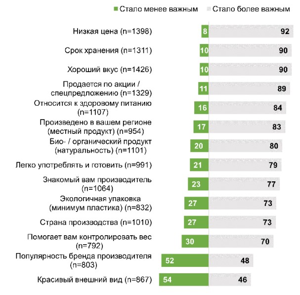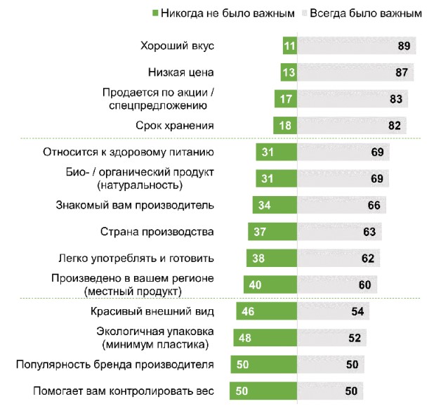 Помимо ключевых критериев, в значительной степени на выбор покупателей влияют также натуральность продукта и то, относится ли он к здоровому питанию (по 69%), известность производителя (66%), страна производства (63%), легкость приготовления (62%), местное производство (60%).