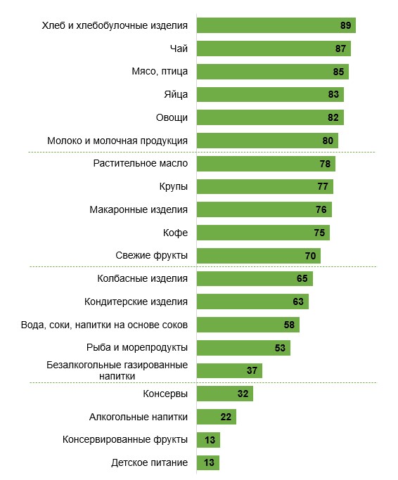 Исследования о том, что жители нашей страны чаще всего включают в свою продовольственную корзину, говорят, что более востребованы среди респондентов хлебобулочные изделия, чай, мясо и птица, яйца, овощи, молочная продукция. Эти продукты покупают практически все (80% и более).