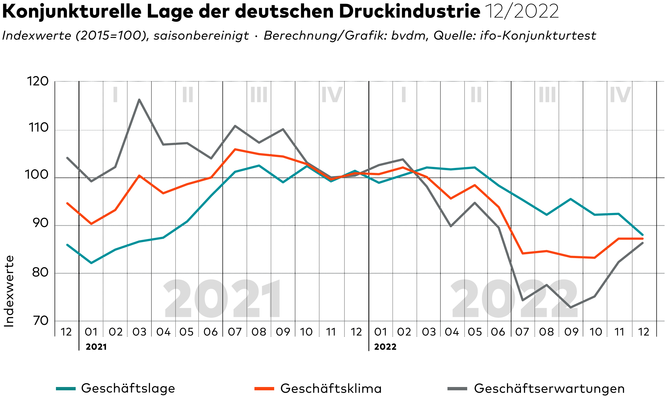 После того как деловой климат в немецкой полиграфической и медиаиндустрии в ноябре несколько улучшился, в декабре произошла стагнация, связанная с противоречивыми тенденциями. Индекс делового климата, рассчитываемый bvdm с учетом сезонных колебаний, остался на уровне предыдущего месяца. Однако при 87,2 пунктах индекс был примерно на 8,1% ниже уровня предыдущего года и на 5 процентных пунктов ниже среднегодового показателя 2022 г.