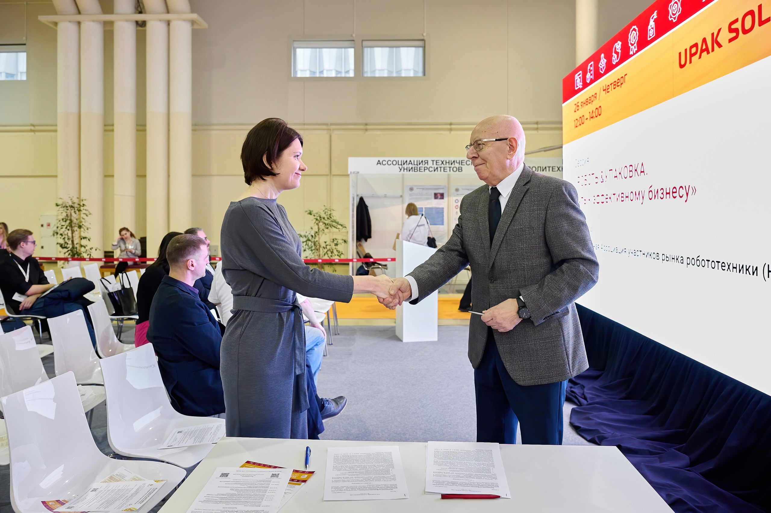 В начале сессии Ольга Мудрова и Александр Бойко, генеральный директор Национальной конфедерации упаковщиков, подписали соглашение о сотрудничестве Национальной Ассоциации участников рынка робототехники и Национальной конфедерации упаковщиков.