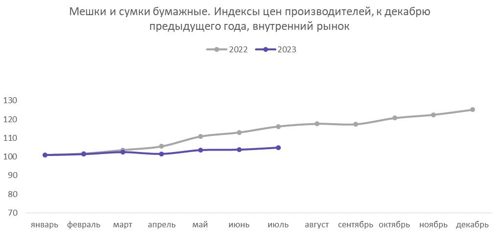 Цены производителей на бумажные мешки и сумки росли весь 2022 г. и к декабрю 2022 г. превысили уровень декабря 2021 г. на 25%. В 2023 г. рост цен приостановился – к июлю 2023 г. цены выросли на 5%.