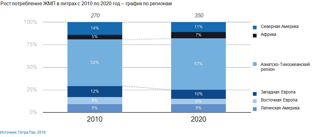 Исследование прогнозирует примерно 30-процентное повышение мирового уровня потребления жидких молочных продуктов в период с 2010 по 2020 год: к концу десятилетия объем рынка составит 350 млрд литров. 57% от этого объема будет востребовано покупателями из Азиатско-Тихоокеанского региона. Производство и потребление таких продуктов, как питьевые йогурты, молочные коктейли, кисломолочные напитки и т.д., также покажет активный рост: к 2020 году объем этого рынка увеличится почти на 60% и перешагнет отметку в 100 млрд литров.