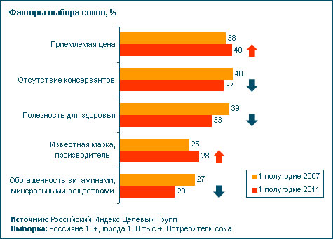 Данные также показывают и изменение мотивации потребителей при выборе соков. В последние несколько лет уверенно растет доля тех, кто руководствуется такими факторами как приемлемая цена (40% опрошенных, 1 квартал 2011 г.) и известность бренда (28% по данным 1 полугодия 2011 г.). Одновременно все меньше людей обращает внимание на отсутствие консервантов (снижение с 40% в 1 пол. 2007 до 37% в 1 пол. 2011 г.), думает об их полезности для здоровья (снижение с 39% в 1 пол. 2007 до 33% в 1 пол. 2011 г.) и обогащенности витаминами (снижение с 27% в 1 пол. 2007 до 20% в 1 пол. 2011 г.).