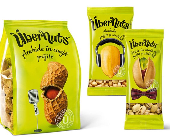 В названии Übernuts использовано немецкое слово ‘über’, которое хорошо известно как в английском, так и в румынском и означает «чрезмерный, отличный, супер». Многозначность слова ‘nuts’ (орехи, чудаки, энтузиасты) добавляет бренду шарм и нацеливает его преимущественно на молодую аудиторию. Дизайн упаковки обыгрывает современную поп-культуру, где даже самая маленькая семечка мечтает стать знаменитым певцом, футболистом или иллюзионистом.