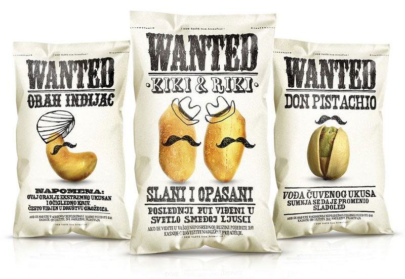 Задачей этого проекта было создание забавной и привлекающей внимание покупателей гибкой упаковки, которая вызывала бы у покупателей ассоциации с наиболее желанной едой. На каждой из упаковок серии изображено объявление о розыске в стиле старых американских вестернов. Персонами, которых требуется немедленно задержать, стали кешью, арахис и фисташки.