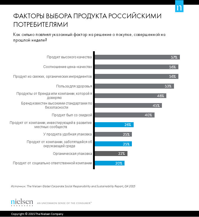 61% потребителей в России готовы платить больше за продукцию компаний, ответственно относящихся к обществу и окружающей среде, показало . В 2014 году таких было 38%. В мире желание платить за заботу о социуме и экологии выразили 66% (+11 п.п. к 2014 году). Данные ритейл-аудита подтверждают вклад социальной ответственности в рост продаж: реализация продукции компаний, популяризующих свои программы устойчивого развития, в среднем в мире за 2014 год выросла на 4%, в то время как у производителей без подобных кампаний – менее чем на 1%*.