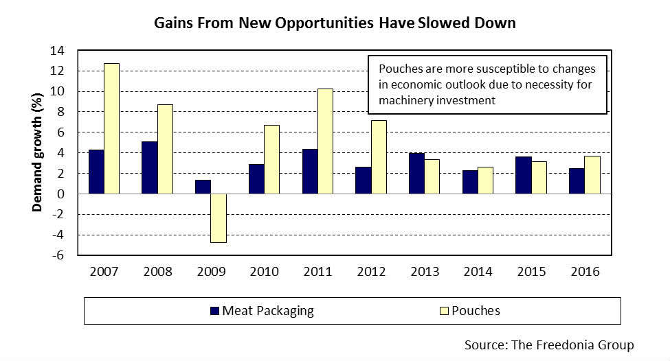 Stand-up pouches are well-positioned for growth in the frozen meat and jerky sectors while retort pouches will continue to see more use in the packaging of processed meat. However, many conversions have already occurred, mitigating gains somewhat going forward.